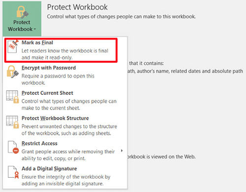 Une autre façon d'empêcher les modifications d'un classeur Excel consiste à marquer le fichier de classeur comme final. Cela affiche une bannière jaune en haut de la page pour indiquer à l'utilisateur qu'il s'agit de la version finale du classeur et qu'elle ne doit pas être modifiée. Cela ne signifie pas pour autant qu’ils ne peuvent pas le modifier. Il existe un bouton Modifier quand même qui permet à l'utilisateur d'apporter des modifications.